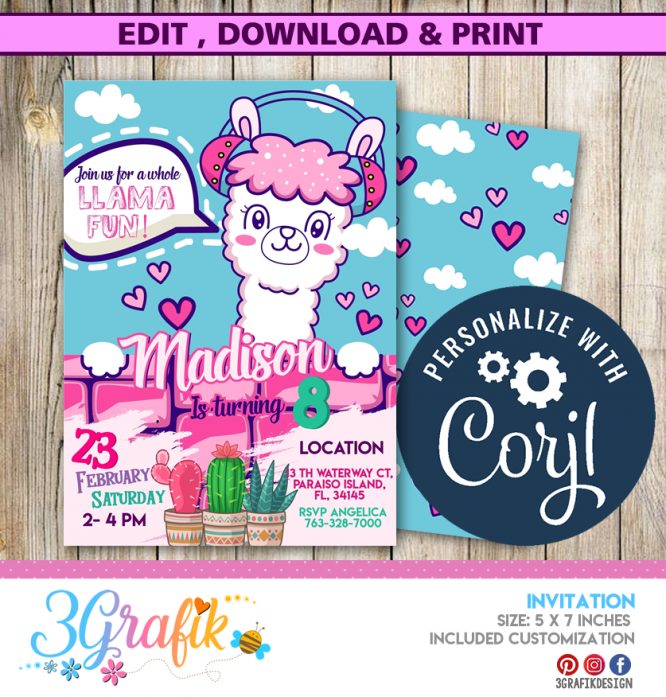 Llama invitation for your events, provide additional details in your decorations in a unique way to keep all your guests surprised