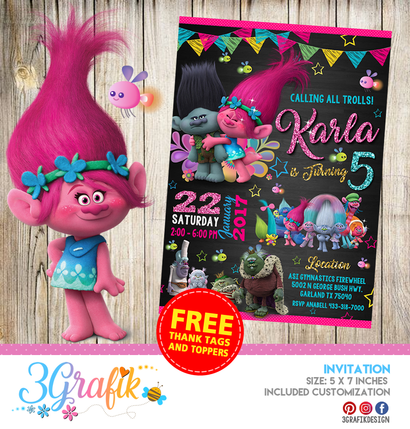 Trolls invitation to surprise your guests with this fabulous design, full of originality and creativity, fully customizable to your liking.